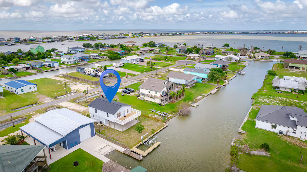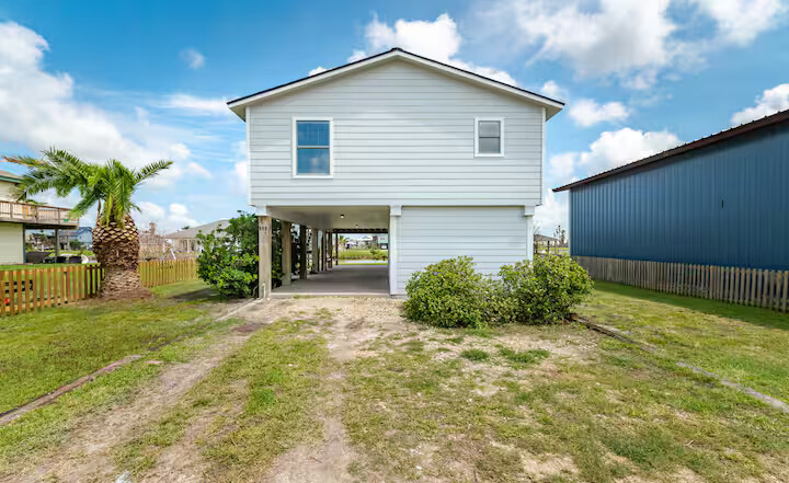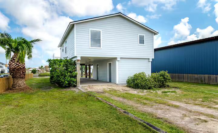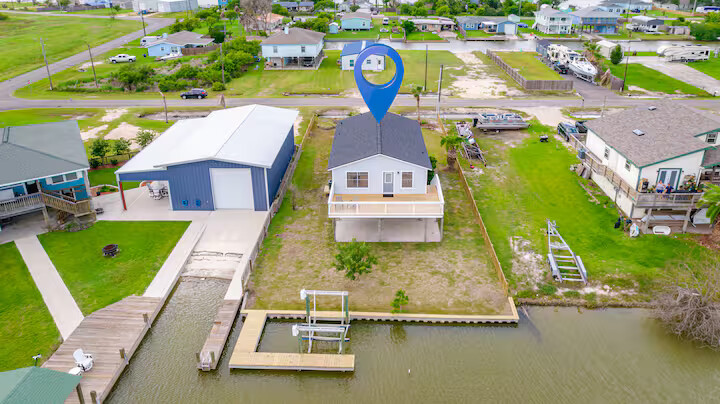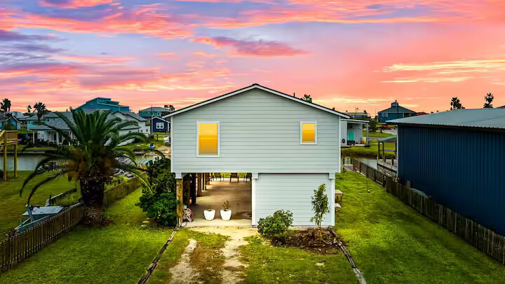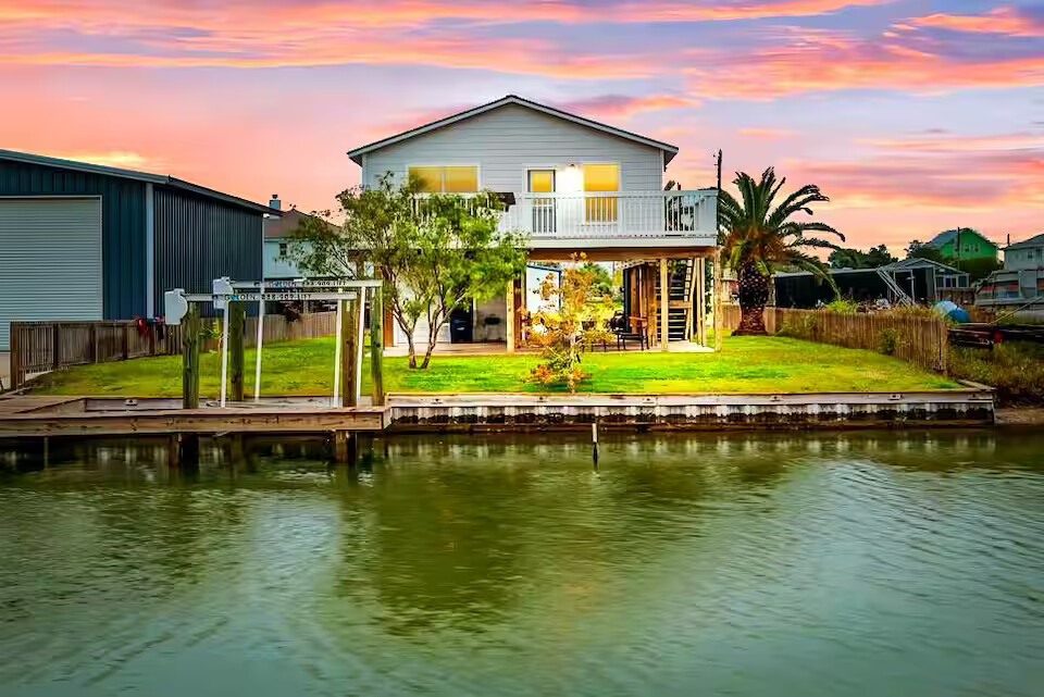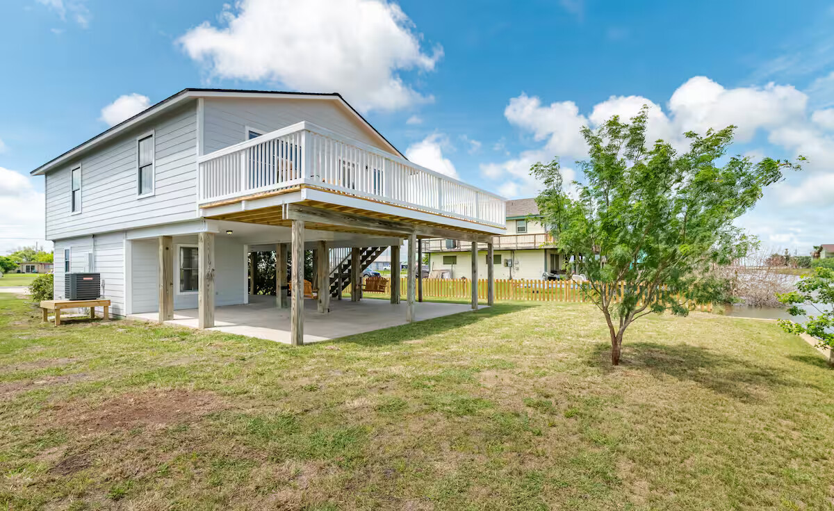 The Dockside Delight Beach House in Rockport is a 3 bedroom, 2 bathroom house on stilts, waterfront on a canal.