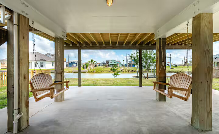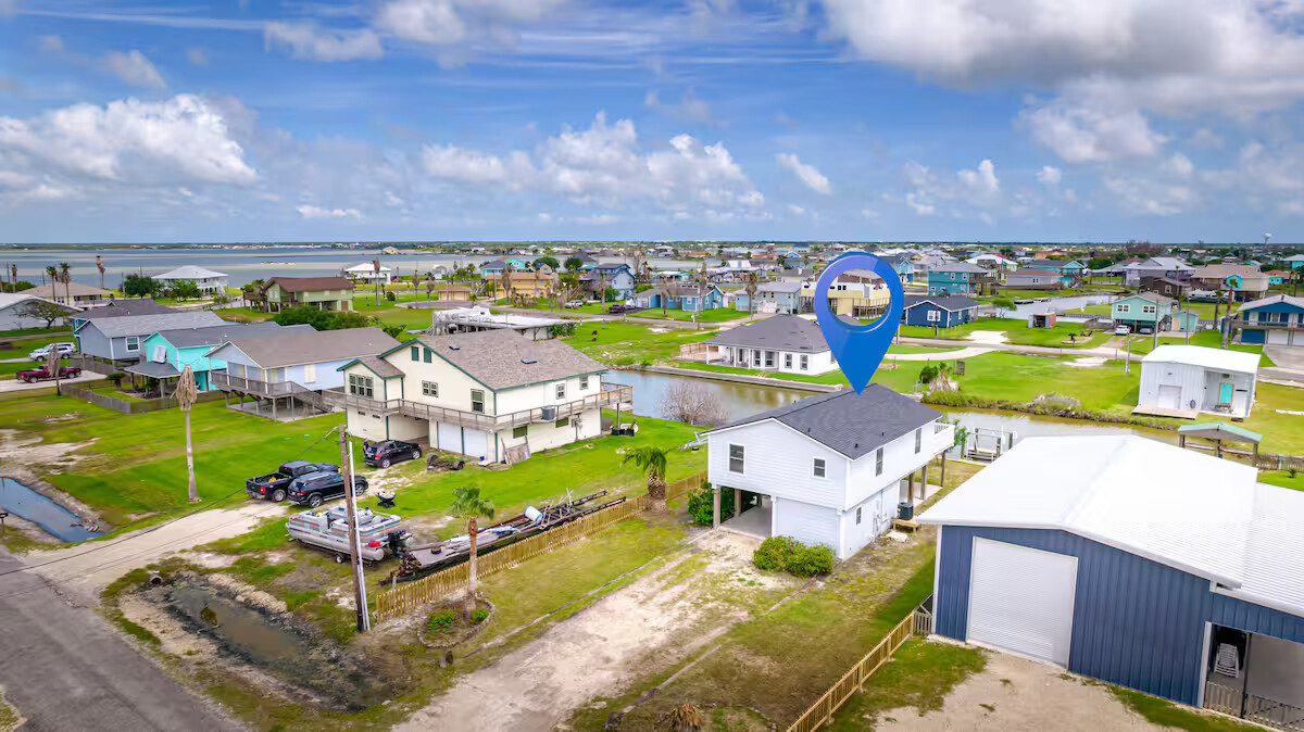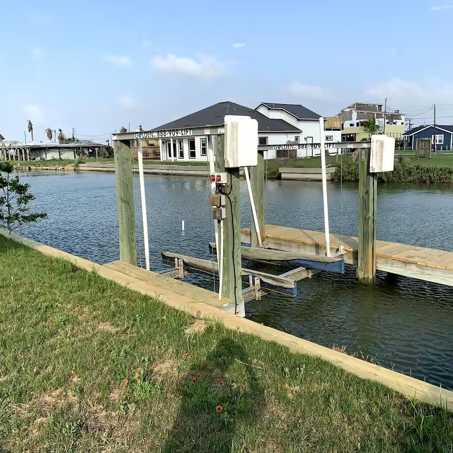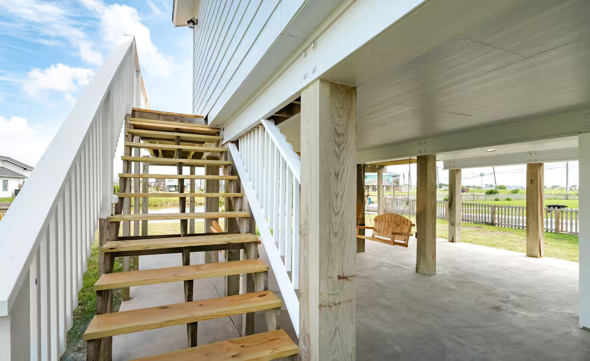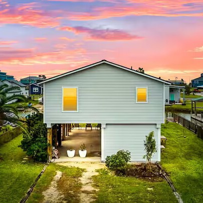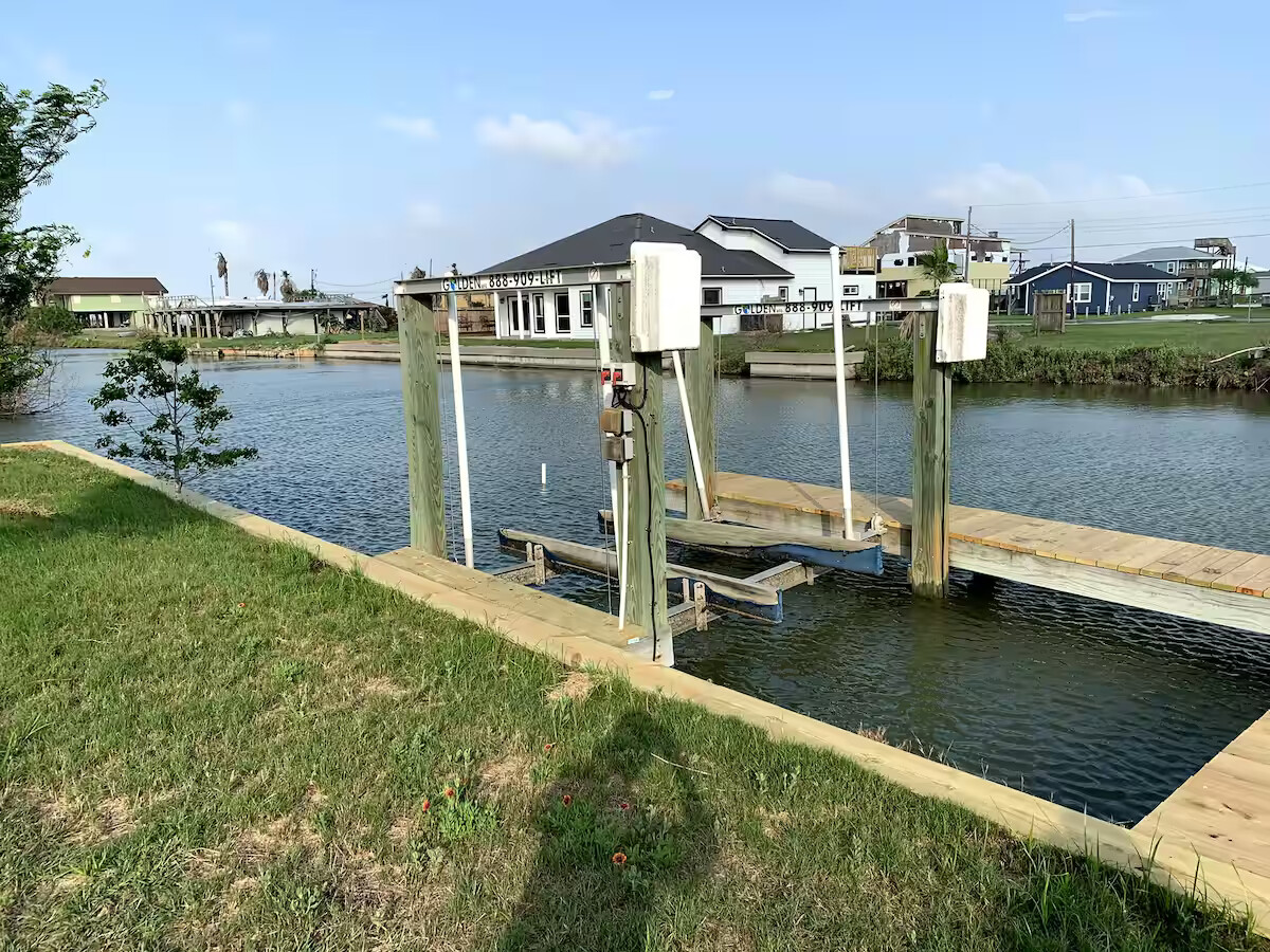 The Dockside Delight Beach House in Rockport is a 3 bedroom, 2 bathroom house on stilts, waterfront on a canal.