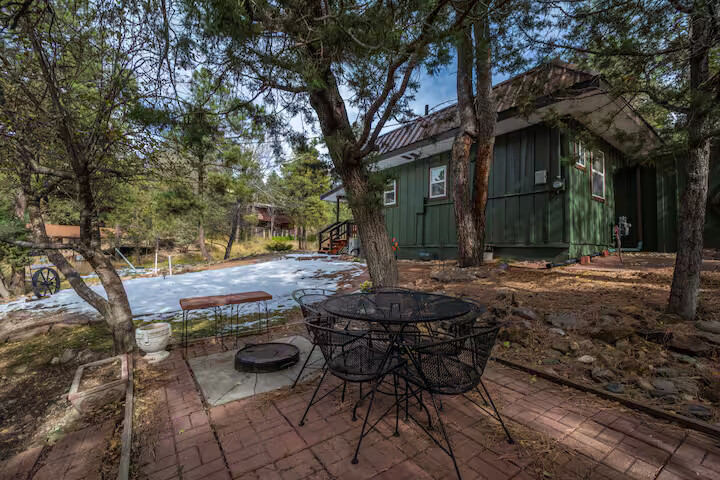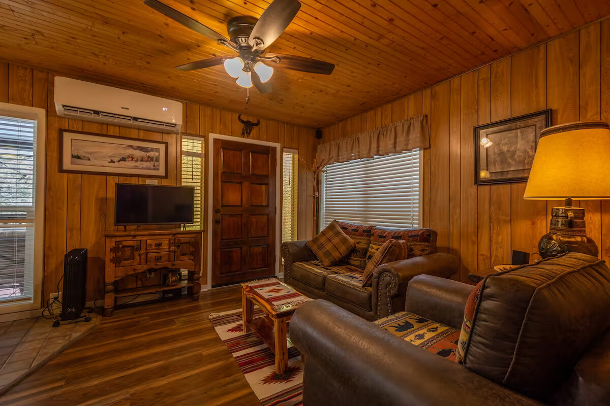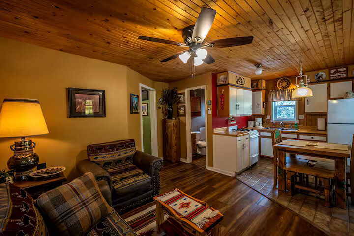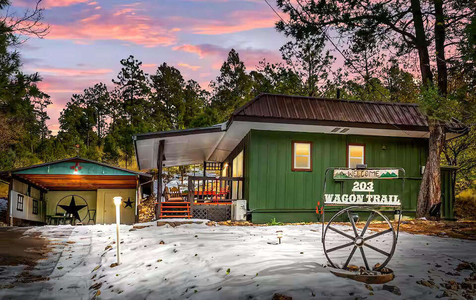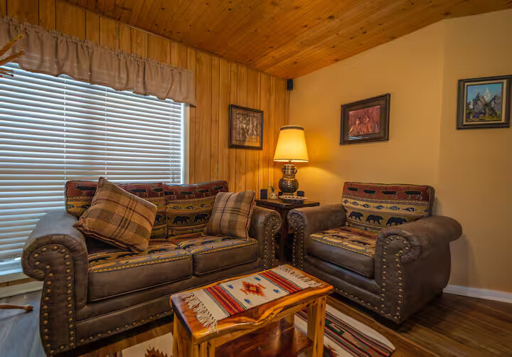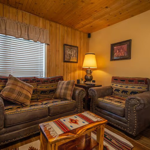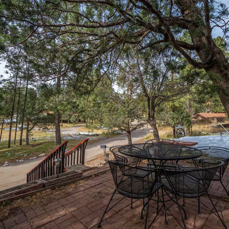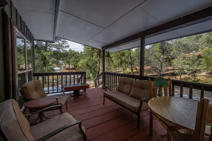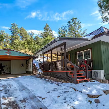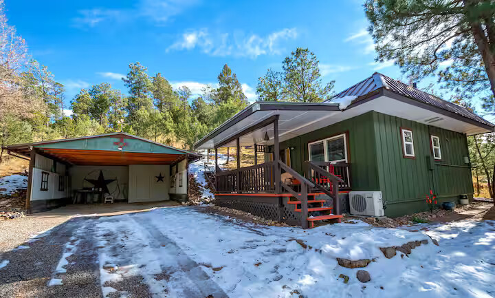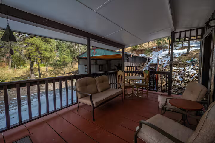 Come enjoy the Whispering Pines cabin to relax in Ruidoso! Our cabin is a 1 bedroom, 2 bathroom with 450 sq feet. A comfortable place to enjoy the area. It features a queen bed in the bedroom and a twin bed in the foldout couch in the living room. The front porch is covered and there is also an outdoor seating area and a hot tub to relax in!