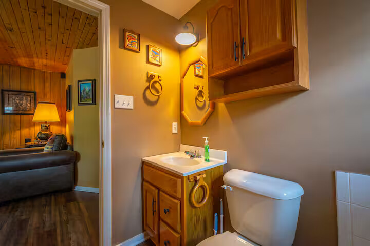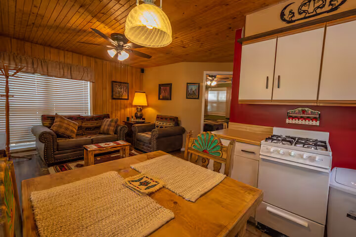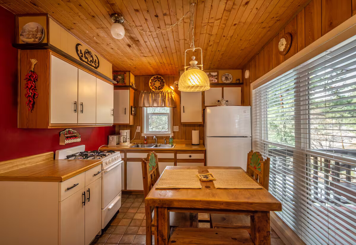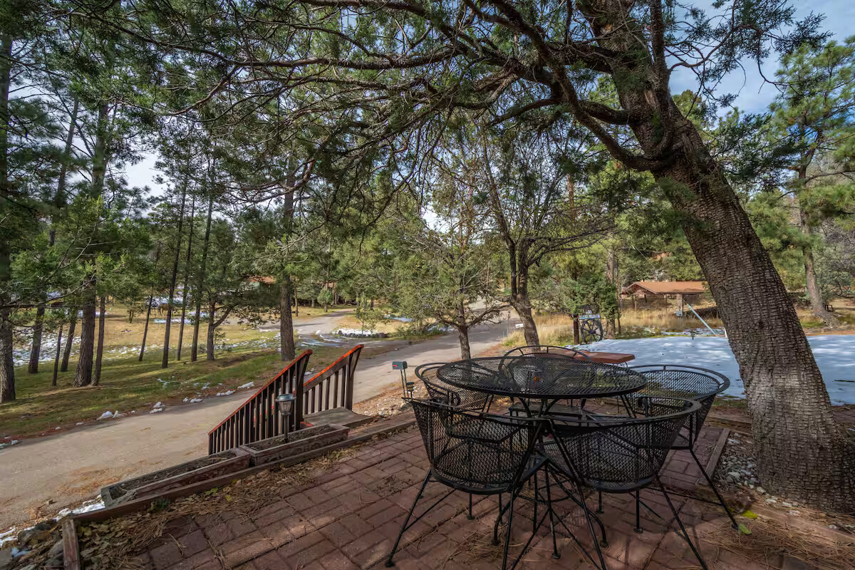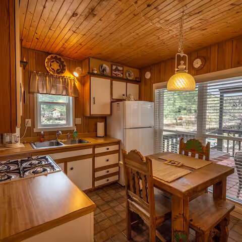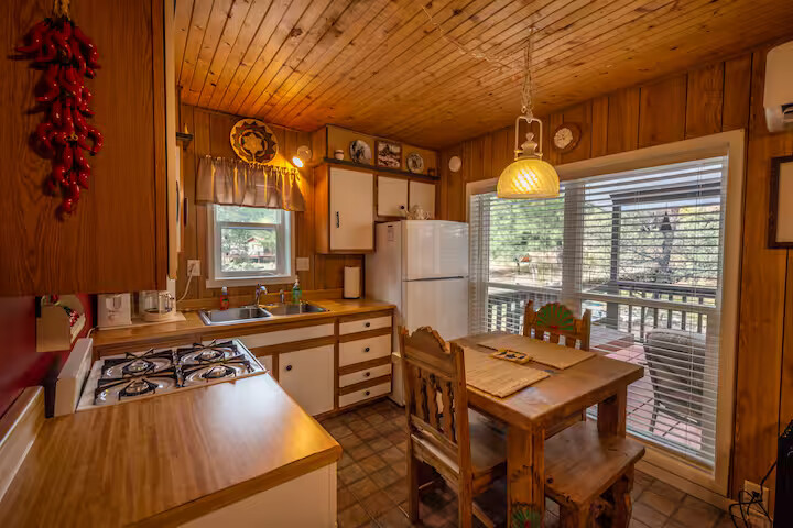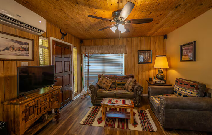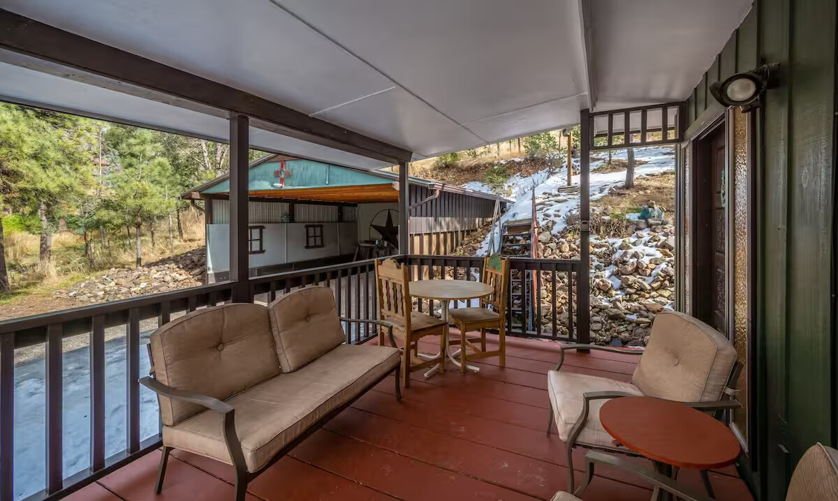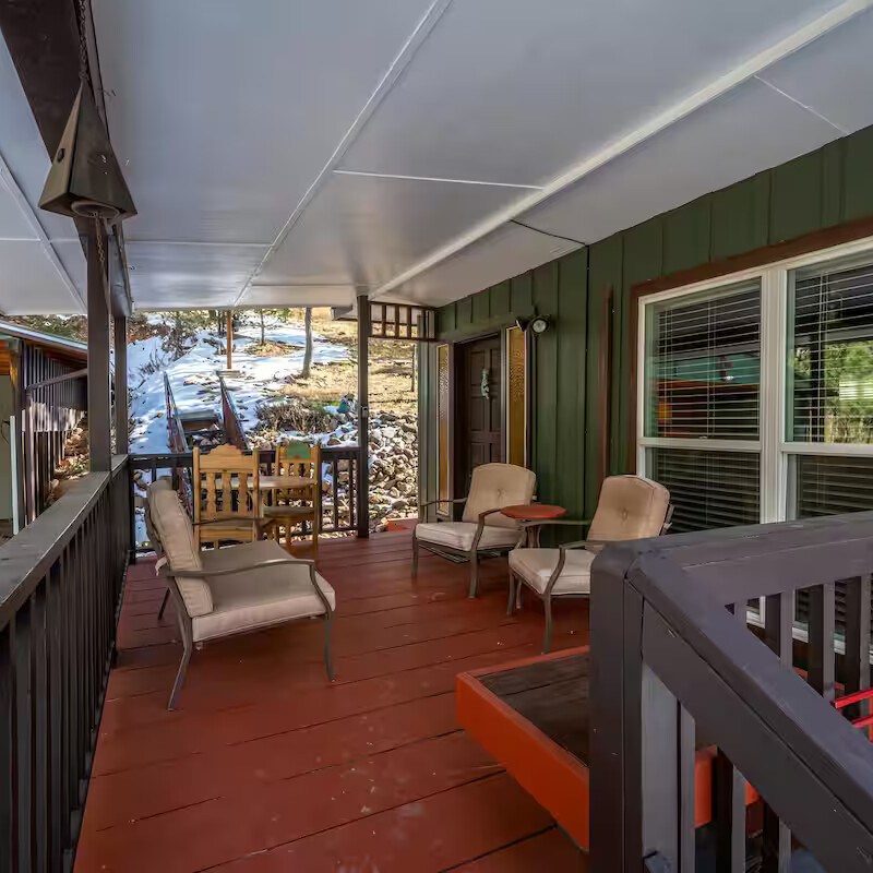 Come enjoy the Whispering Pines cabin to relax in Ruidoso! Our cabin is a 1 bedroom, 2 bathroom with 450 sq feet. A comfortable place to enjoy the area. It features a queen bed in the bedroom and a twin bed in the foldout couch in the living room. The front porch is covered and there is also an outdoor seating area and a hot tub to relax in!